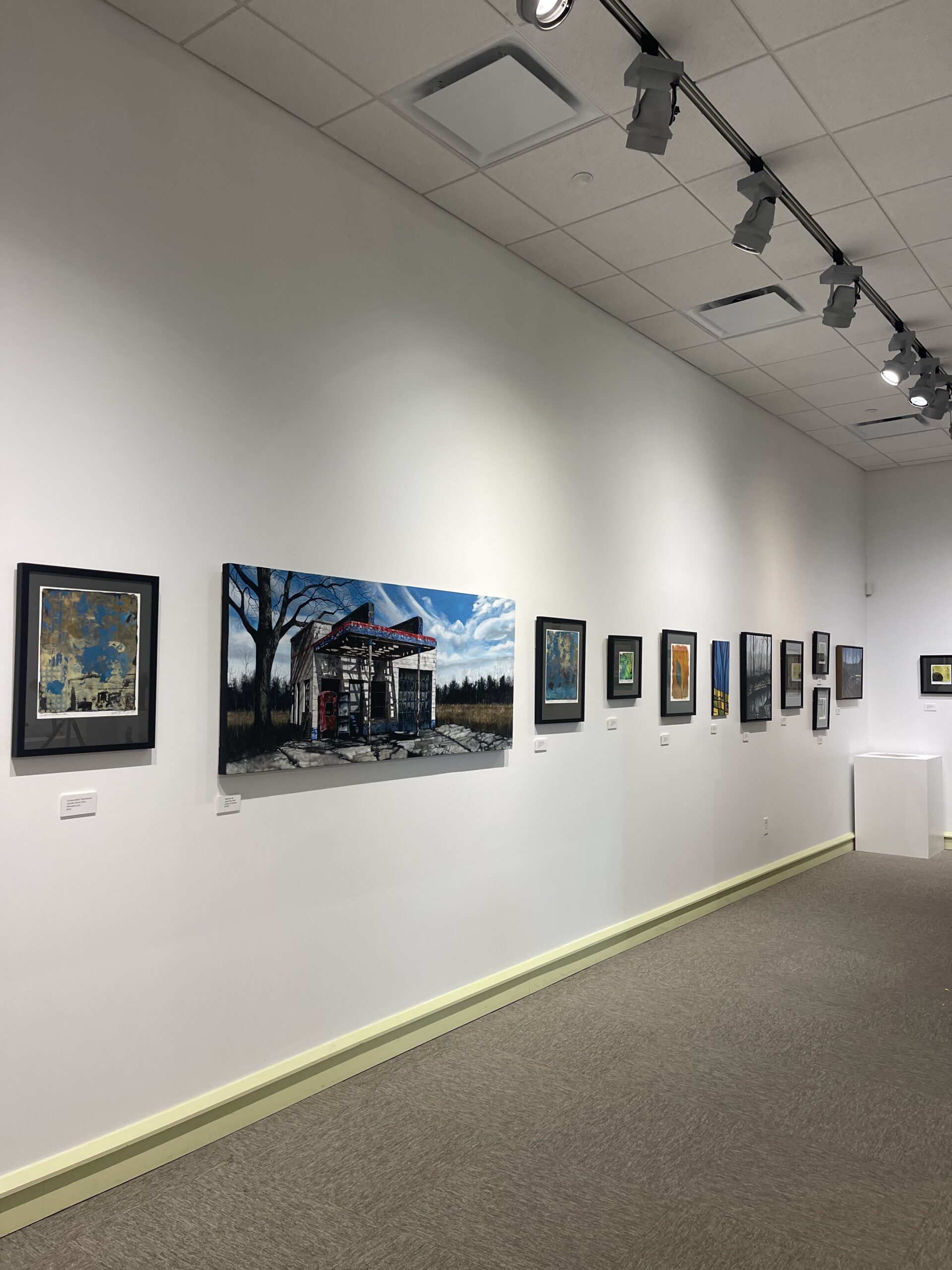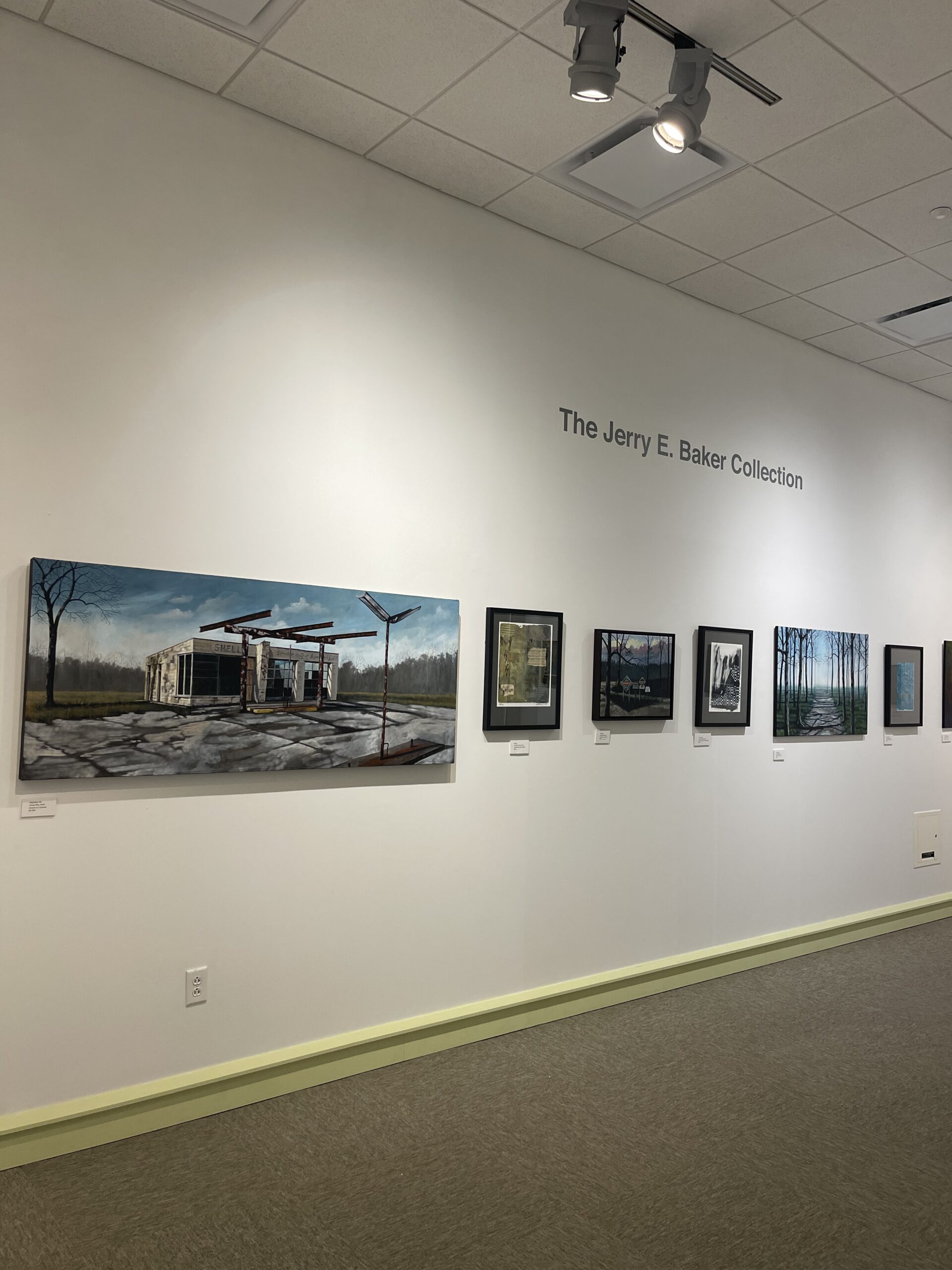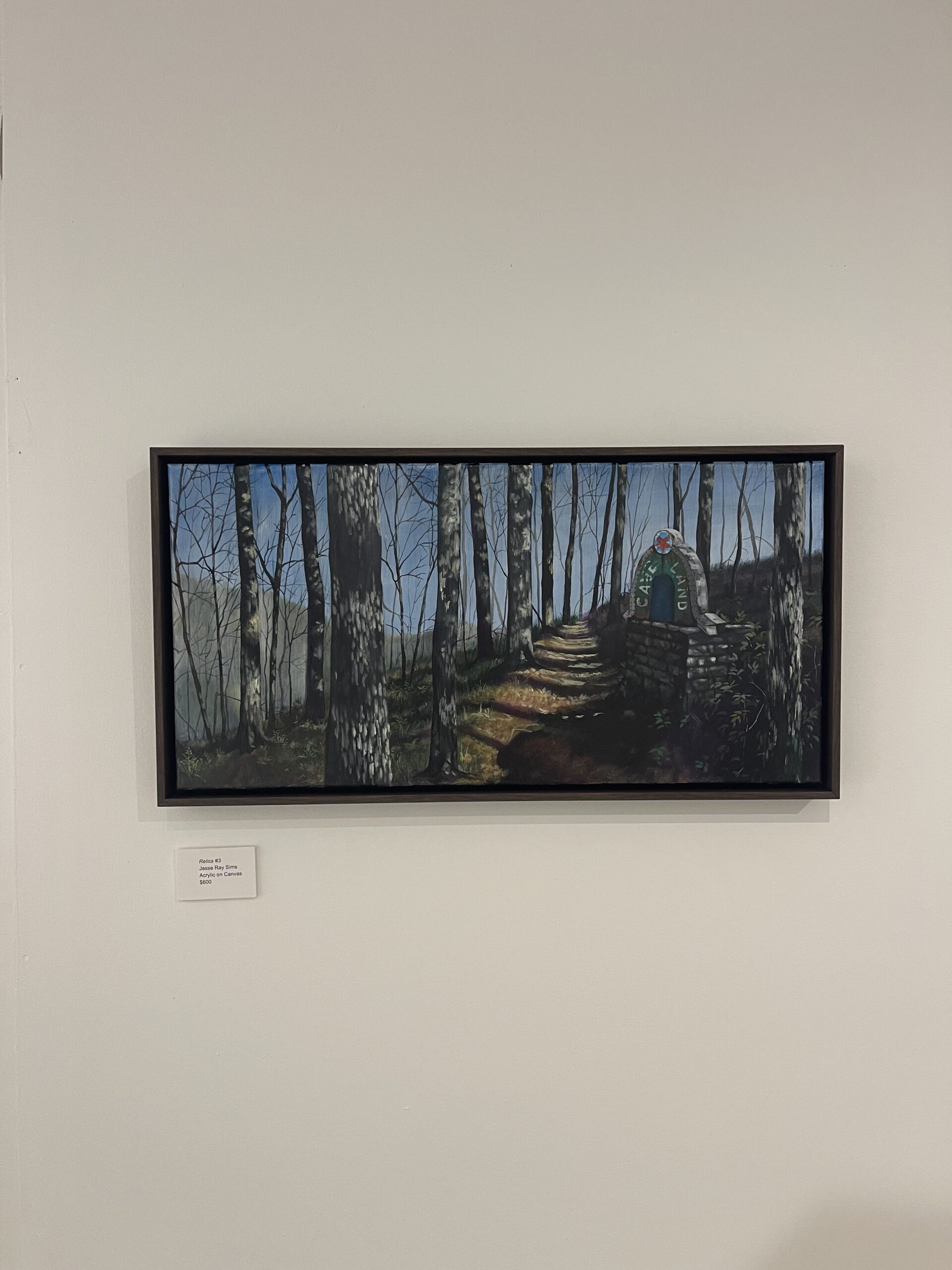 Jesse Ray Sims’ work draws from his background in architectural drafting and restoration, blending gothic influences with imagery from rural Kentucky. His paintings reflect a quiet reverence for fading structures and forgotten spaces.